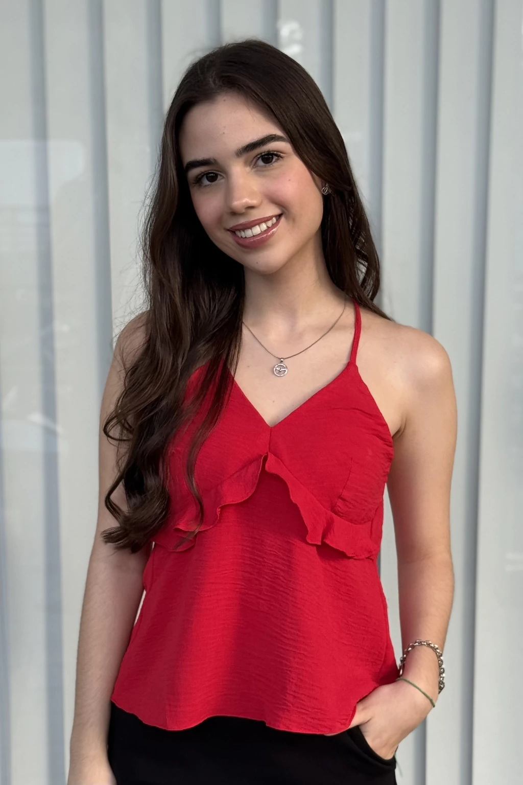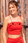 Delicada e feminina, essa bata é perfeita para composições leves e estilosas. Com detalhe de babados no busto, ela traz um toque romântico e elegante. O efeito evasê na parte inferior proporciona fluidez e conforto, enquanto as alças de amarração permitem ajuste personalizado.